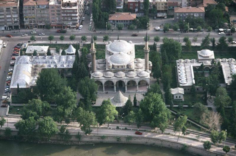 Doğu kısmındaki minaresi renkli taşlarla yivli, batı kısmındaki minare ise palmetlerle süslü olarak yapılmıştır. Batıda "U" plan şemasına sahip medrese mevcuttur. Doğudaki "L" plan şemail yapı imaret ve konuk evidir. Her iki minare hizasında bulunan yaşlı çınar ağaçlarının külliye ile yaşıt olduğu tahmin edilmektedir. |